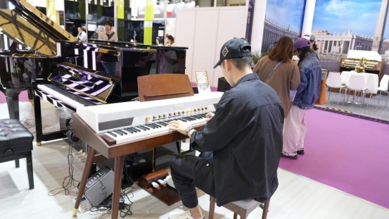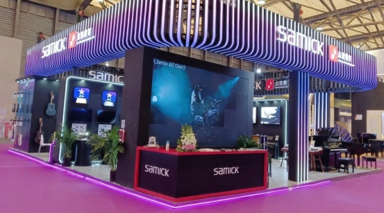 SAMICK展台以其“科技感+互动性”为核心设计理念,成功打造了一个兼具视觉冲击力与体验感的全景式智能空间。整体色调采用梦幻的粉紫渐变,并融合了动态光影效果和模块化展示设计,将“数字×智能”的主题贯穿于每一个细节之中。展台特别设置了三大互动体验区:智能演奏体验区让参与者感受即兴演奏的乐趣;数字创作工作站为音乐制作提供了无限的可能性;场景化应用展示区则让音乐融入各种生活场景。参观者不仅可以“看产品”,更能深度“玩音乐”,无论专业音乐人还是初学者,都能找到属于自己的互动场景。这种沉浸式的体验让每一位参观者都能感受到音乐与科技融合所带来的独特魅力,尽情享受这场视听的盛宴。