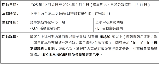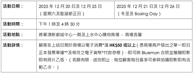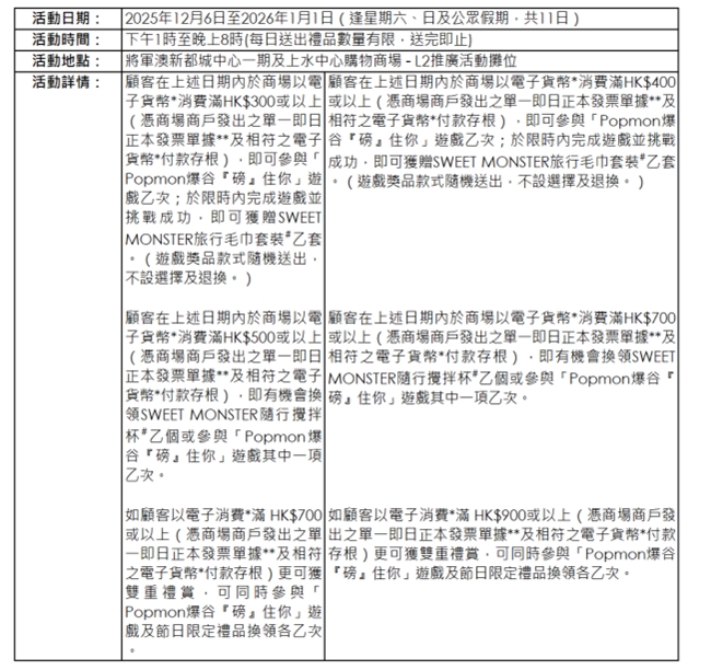 活動受條款及細則約束,更多詳情請參考商場內活動宣傳海報及商場Facebook專頁:https://www.facebook.com/SSCxMCP1