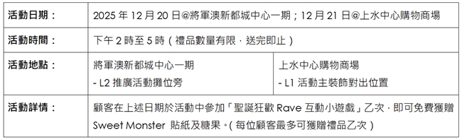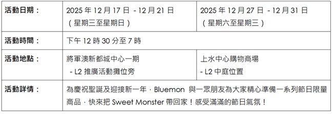 今個聖誕,上水中心購物商場(SSC)與 新都城中心一期 (MCPOne) 聯乘韓國人氣 IP Sweet Monster呈獻 「「型」玩Sweet Monster聖誕遊樂園」!由即日起至2026年1月4日,兩大商場同步換上潮酷新裝,化身成色彩繽紛、玩味十足的街頭遊樂場,濃厚節慶氣氛洋溢,為顧客帶來驚喜連連的節日體驗。是次活動精心策劃多個特色打卡場景及互動遊戲,包括刺激好玩的「拍、拍、拍!閃亮聖誕樹大挑戰」,與潮萌主角Bluemon近距離互動,以及超Chill DJ音樂派對。場內更特設Sweet Monster精品快閃店,發售獨家限定禮品;以及聯同美食商戶炮製限定甜品。這場集「打卡、食、玩、買」於一身的聖誕嘉年華,從場景裝置、互動體驗、獨家禮品到美食企劃,全方位展現Sweet Monster攪鬼趣怪的獨特魅力。現誠邀大家與摯愛親朋蒞臨參與,一同沉浸於最潮最甜的節日氛圍!