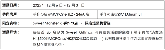 除了「超好拍」打卡裝置外,兩大商場亦精心準備一系列互動活動與消費禮遇,讓顧客盡情歡度佳節!於MCPOne 及 SSC以電子消費滿 HK$50 或以上,即可參加「拍、拍、拍!閃亮聖誕樹大挑戰」,眼明手快完成遊戲,即有機會贏取豐富獎品!「Sweet Giftmas 消費禮賞」 為大家送上甜蜜又實用的獨家限定禮品,顧客只須消費滿指定金額,即有機會把 SWEET MONSTER 旅行毛巾套裝及隨行攪拌杯等聖誕好禮帶回家,送禮或自用同樣適合。活動期間的指定週末,商場將舉行「Monster Beat DJ 音樂派對,由專業DJ 現場打碟,精選播放Chill & Festive music,顧客邊逛邊聽好音樂,感受滿滿聖誕氛圍!聖誕檔期當然少不了人氣主角 Bluemon 驚喜現身商場!顧客只需以電子消費滿 HK$50 或以上,即可參與 「Photo Day - Blue Mon 聖誕見面會!」,與藍色型格萌主Bluemon合照,並獲贈極具紀念價值的即影即有乙張。作為韓國甜品品牌的 Sweet Monster 難得再度登陸香港,今次更特意配合聖誕檔期,crossover商場租戶「手作の店」推出節日限定「爆爆脆雪糕」,香滑雲呢拿雪糕配上香脆濃郁焦糖爆谷,為顧客味蕾帶來今個聖誕限定的甜蜜滋味。更多精彩活動詳情如下: