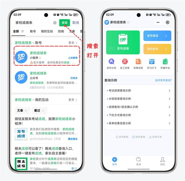 第一步,打开微信,在搜索栏搜【家校成绩表】,找到对应的小程序,点击进入就可以,不用注册账号,不用绑定手机号,也不用下载任何APP,即开即用,省去很多麻烦。进入之后,首页特别干净,只有“发布成绩”“我的发布”两个核心入口,没有多余的广告和杂乱的功能,一眼就能找到自己要用的。