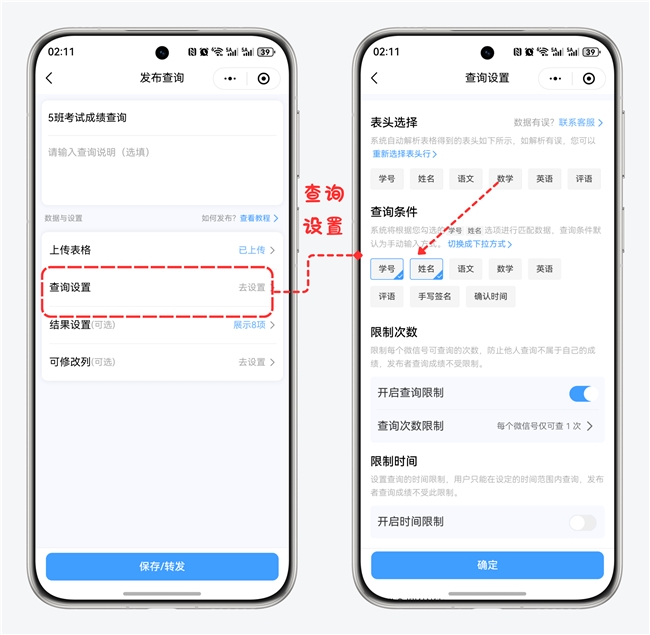 第二步,点击“发布成绩”,开始创建成绩查询。首先要填一个查询名称,不用太复杂,比如“XX班期末数学成绩”“XX年级期末语文成绩”,这样家长一看就知道是什么成绩,也方便自己后续查找。然后选择查询时间,默认是永久有效,也可以根据自己的需求设置有效期,比如只让家长1天内查询,过期后就不能查看,避免后续成绩信息泄露,更安全。